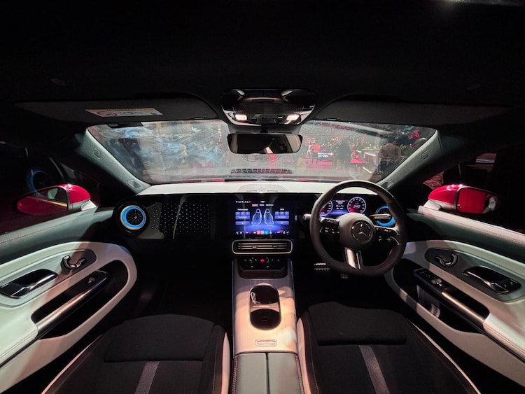 Flush-fitting door handles sit seamlessly within the bodywork and extend automatically when the car is unlocked. The India-spec CLA 250+ comes standard with the AMG Line package, bringing sportier bumpers, aluminium pedals, and 18-inch AMG alloy wheels. A logo projector and illuminated grille are also part of the standard kit.