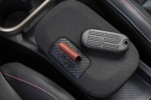 The leather-wrapped sports steering wheel features a distinctive multi-colour 6 o’clock marker along with a ‘1965’ emblem. The same motif appears on the centre storage compartment lid, upholstered in a textured fabric finish. Even the key fob receives the celebratory treatment, finished in black with the historic ’52’ insignia, a subtle yet constant reminder of Mini’s rally pedigree.