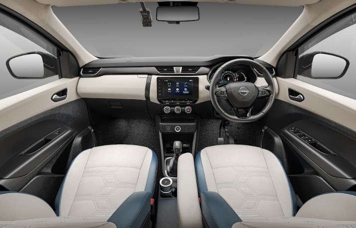 - The steering wheel, shared with the Magnite, features gloss black accents, leatherette wrapping and steering-mounted controls.