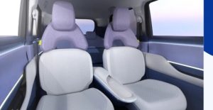 Blue and purple accents dominate the interior palette, offset by beige trims on the armrests and lower seat sections. The split-type front seats, with their sculpted headrests, add to the premium and futuristic impression. Some of the switchgear, particularly the mirror controls may be repositioned before production to improve ergonomics.