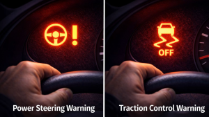 The power steering warning light indicates a problem with the steering assistance system. Power steering reduces the effort required to turn the steering wheel, especially at low speeds. If the warning light appears, steering may become heavier. The issue may be caused by low power steering fluid, a faulty pump or an electrical fault in vehicles with electric power steering. The steering system should be inspected if the warning persists.