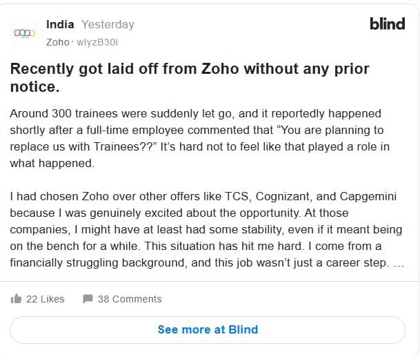 In the post, a user wrote: “Recently got laid off from Zoho without any prior notice.”