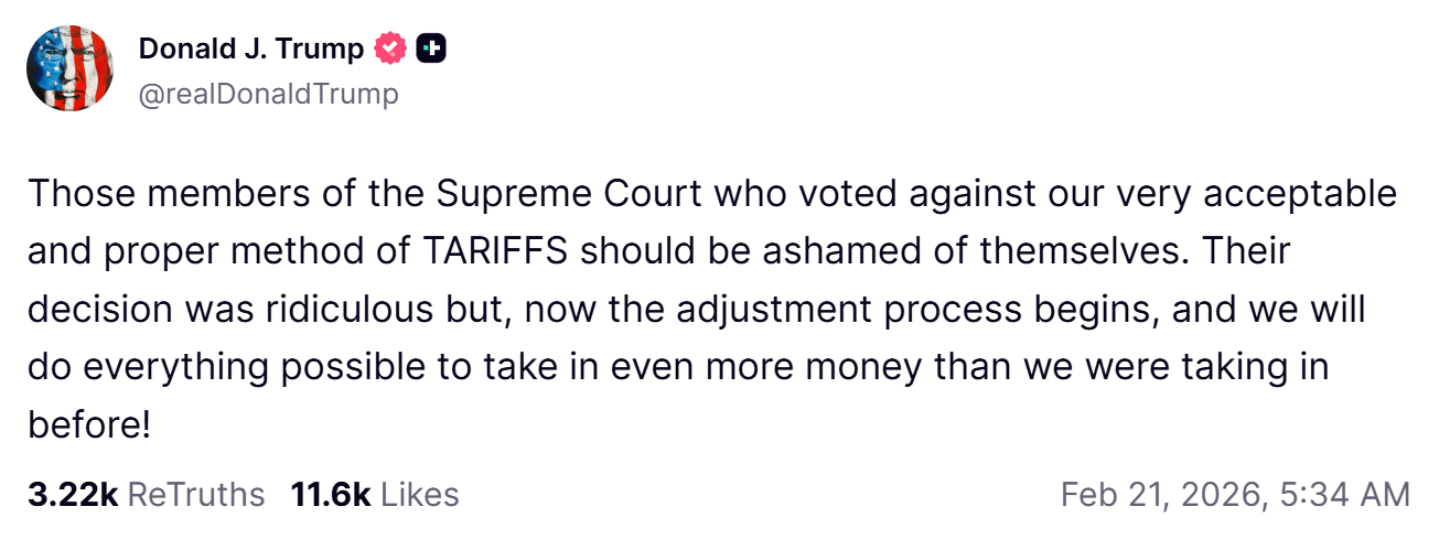 On his Truth Social, he wrote, “Those members of the Supreme Court who voted against our very acceptable and proper method of TARIFFS should be ashamed of themselves. Their decision was ridiculous but, now the adjustment process begins, and we will do everything possible to take in even more money than we were taking in before!”