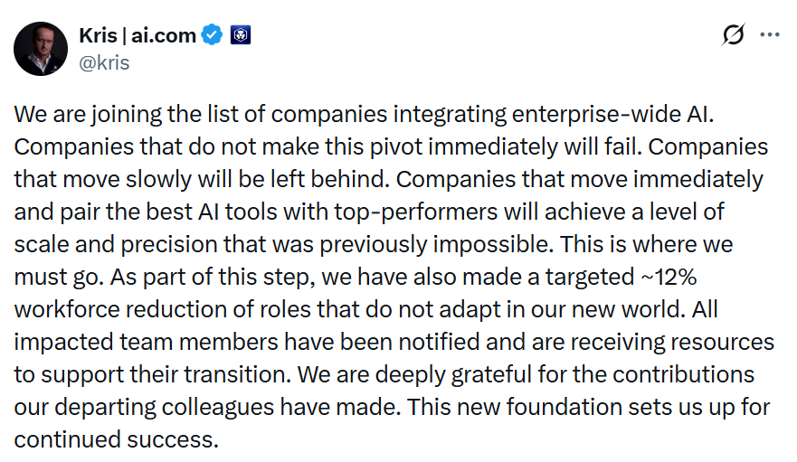 “We are joining the list of companies integrating enterprise-wide AI. Companies that do not make this pivot immediately will fail. Companies that move slowly will be left behind,” CEO Kris Marszalek posted on X (formerly Twitter).