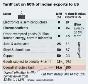 • Major Tariff Cuts: 60% of Indian exports to the US get duty relief.