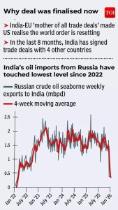 • Russian Oil Concession: US agrees to a “supply shuffle,” allowing India to continue Russian crude imports without sanctions.