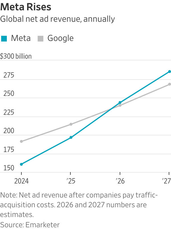 Meta Platforms is expected to surpass Alphabet’s Google to become the world’s leading digital-advertising business, a first for the social-media company.