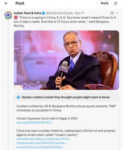 While Murthy used China as an example, social media users highlighted that China banned the 9-9-6 model in 2021 following reports of burnout, health risks, and deaths linked to excessive working hours.