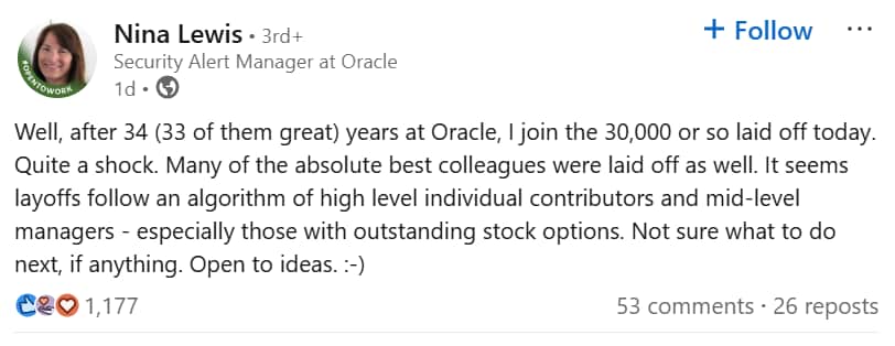 “Well, after 34 (33 of them great) years at Oracle, I join the 30,000 or so laid off today. Quite a shock. Many of the absolute best colleagues were laid off as well,” she wrote in the post.