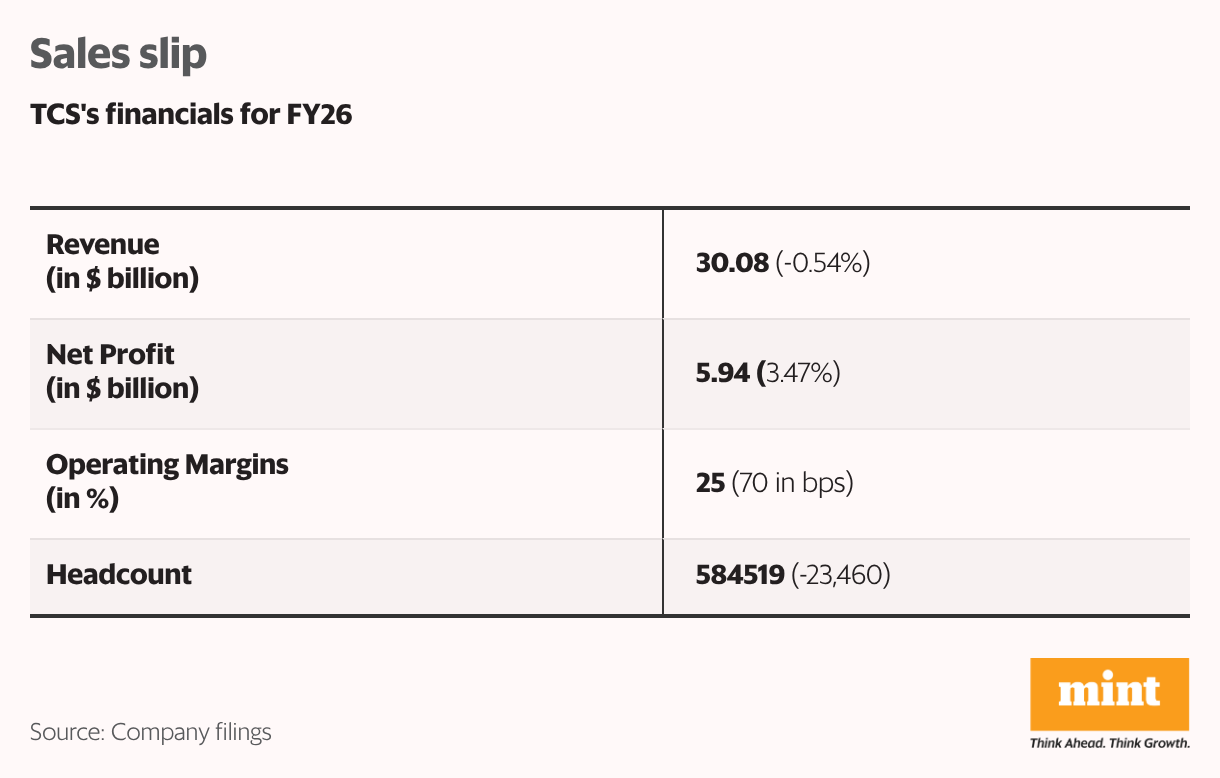 Tata Consultancy Services (TCS) closed FY26 with a modest recovery in quarterly growth, but not enough to offset a broader slowdown that pushed it into its first full-year revenue decline in dollar terms since listing.