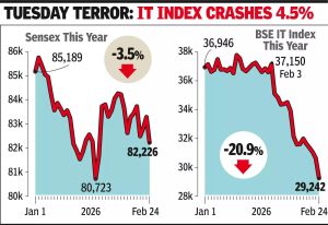 MUMBAI: A global sell-off in a large number of technology stocks affected investor sentiment on Dalal Street on Tuesday, resulting in sensex sliding by 1,069 points or 1. 3% to close at 82,226 points. The current sell-off is on the back of fears that AI models could upend established business models of a large number of IT giants including Indian majors like TCS, Infosys, Wipro and others. Global players like IBM and Accenture too are on the same boat.