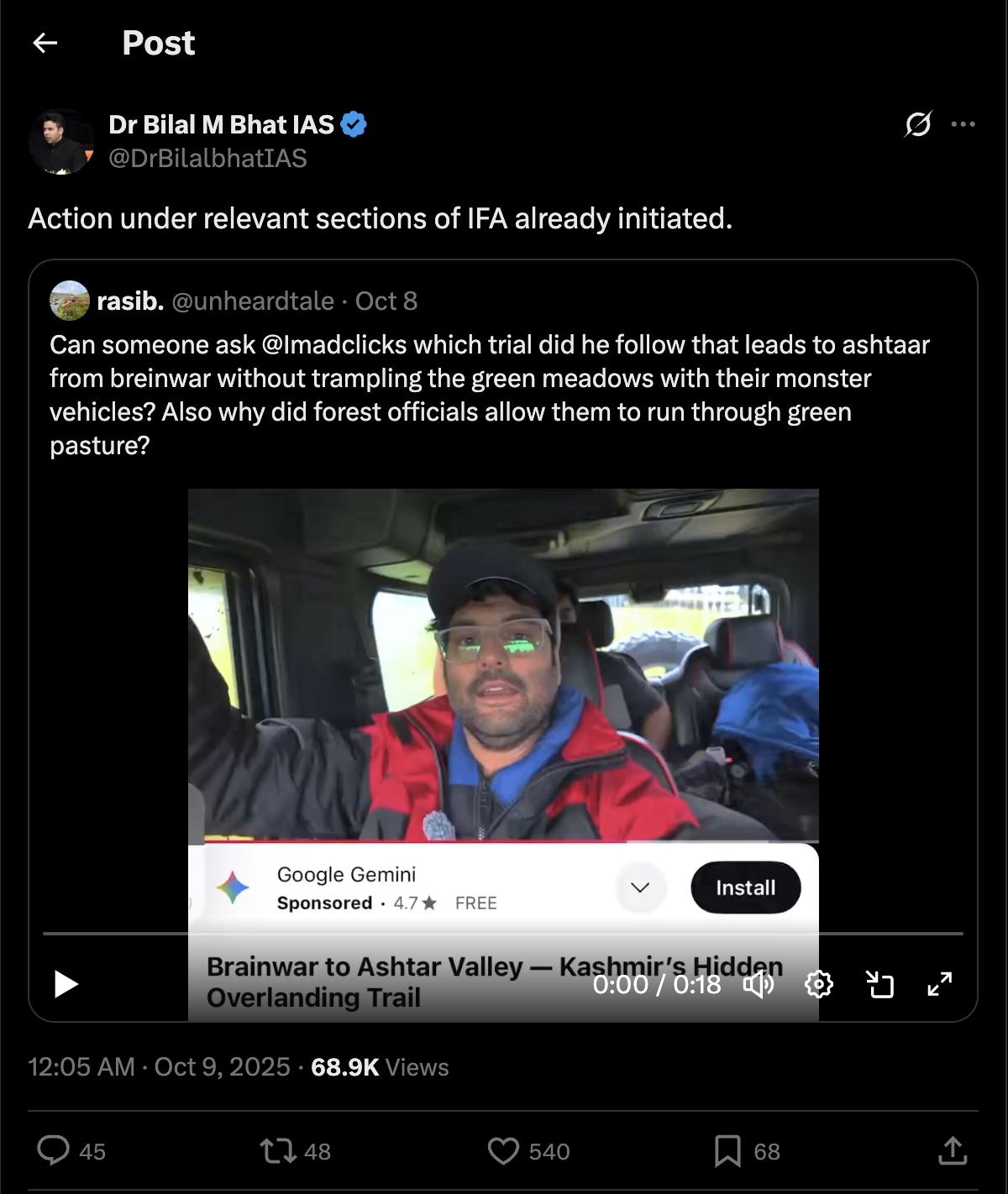 Authorities in Budgam, Kashmir have filed a First Information Report (FIR) against social media influencers after a viral video showed them driving vehicles across protected forest meadows. The incident in Breinwar forests sparked widespread online outrage and demands for strict action.