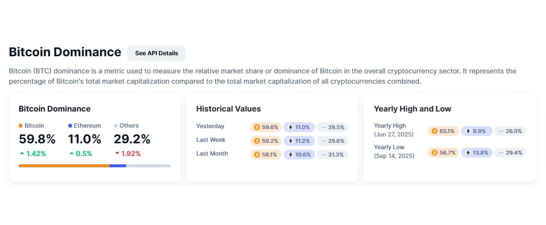 Among top tokens, Bitcoin dominates the market share with 59.8% of the pie (up 1.42%), followed by Ethereum which holds 11% (increase of 0.5%), while other coins comprise 29.2% of the market, (down 1.92%), it added.
