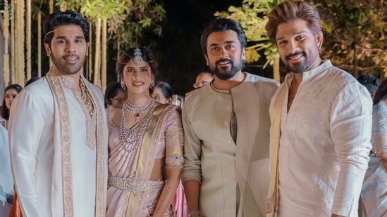 Suriya also attended the wedding, dressed in a simple kurta-pyjama. He waved at the paparazzi as he left the venue. One video circulating online shows the actor standing near Arjun and being invited onto the stage to bless the couple. Sirish’s uncle, actor Chiranjeevi, can be seen blessing Sirish and Nayanika after their wedding.