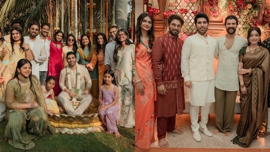 Rashmika Mandanna and Vijay Deverakonda attended the pre-wedding festivities and were seen posing with Allu Arjun and Allu Sirish for photographs.
