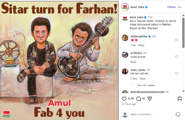 Amul captioned its creative: “Actor-director all set to make Hollywood debut in Beatles biopic as Ravi Shankar!” The wordplay — “Sitar Turn for Farhan”– plays on both the instrument and the shift in his career trajectory. Farhan reshared the tribute, thanking the brand for the nod.
