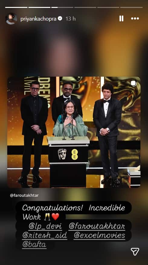 Priyanka also congratulated the team, writing, “Congratulations! Incredible Work @lp_devi @ritesh_sid @faroutakhtar @excelmovies @bafta”