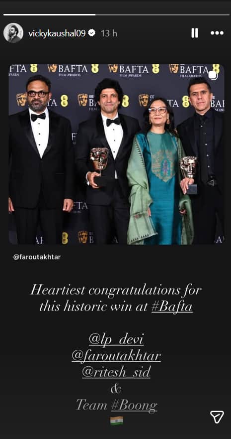 Vicky Kaushal termed it a “Heartiest congratulations for this historic win at #Bafta @Ip_devi @faroutakhtar @ritesh_sid Team #Boong”