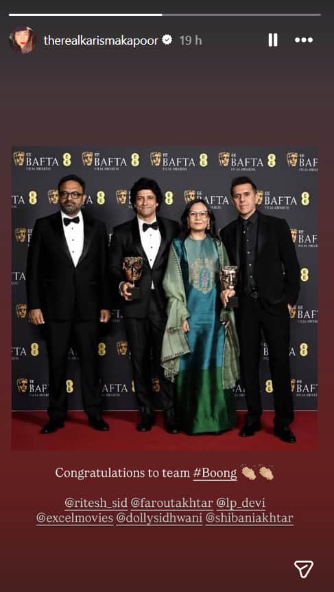 Karisma Kapoor took to her social media and wished, writing, “Congratulations to team #Boong @ritesh sid ofaroutakhtar @lp_devi @excelmovies @dollysidhwani @shibaniakhtar”