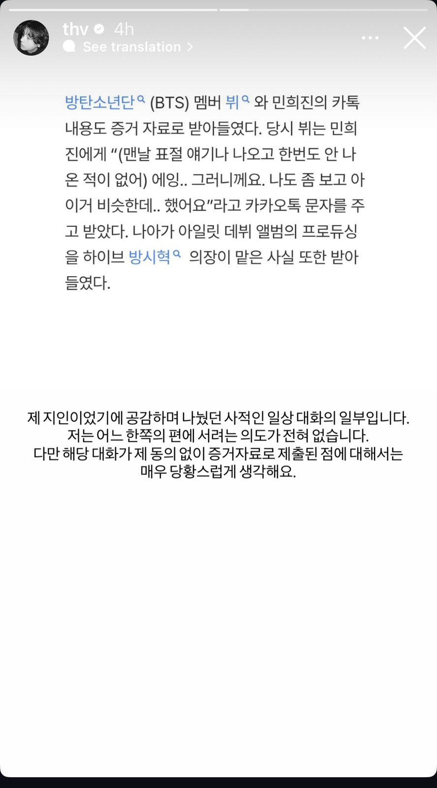 It was during this period of plagiarism discussions that Min’s legal team submitted private KakaoTalk chats with V, in which V reportedly said he also saw similarities, as part of her evidence in court.