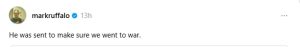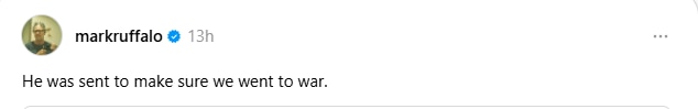 On Instagram Threads, Mark Ruffalo shared an article about one of Trump’s lead negotiators with Iran, Jared Kushner, and wrote, “He was sent to make sure we went to war (sic).”