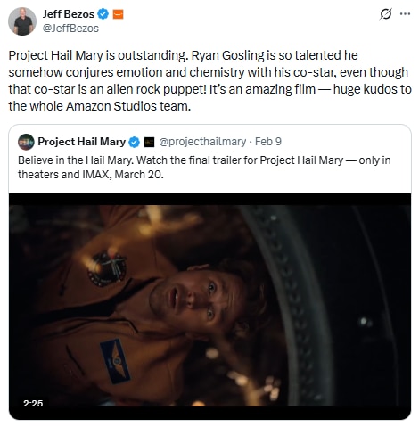 “Project Hail Mary is outstanding. Ryan Gosling is so talented he somehow conjures emotion and chemistry with his co-star, even though that co-star is an alien rock puppet! It’s an amazing film — huge kudos to the whole Amazon Studios team (sic),” Bezos wrote, giving the sci-fi drama a high-profile endorsement.