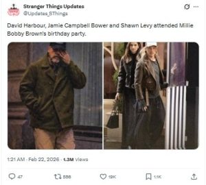 Millie Bobby Brown celebrated her 22nd birthday on February 20 at Maison Close Restaurant, surrounded by family and close friends. Best known for playing Eleven in Stranger Things, the actor was also joined by co-star David Harbour. The reunion comes nearly four months after the Daily Mail reported that Brown had allegedly filed a bullying and harassment complaint against her 50-year-old co-star ahead of Season 5.