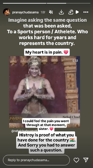 Nehal Chudasama’s brother Pranay Chudasama shared a reel of her beauty pageant journey on his Instagram stories. He then expressed being extremely hurt by Salman Khan questioning Nehal’s achievements. “Imagine asking the same question that was been asked, to a sportsperson/athlete. Who works hard for years and represents the country. My heart is in pain,” he wrote. He further added, “I could feel the pain you went through at that moment, sister. History is proof of what you have done for the country. And Sorry you had to answer such a question.” Check out his Instagram story below!