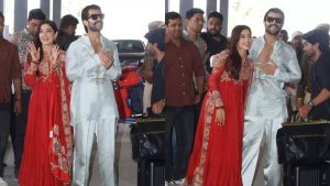 Rashmika Mandanna and Vijay Deverakonda tied the knot in Udaipur on February 26. The couple had an intimate ceremony in presence of their family and close friends. As they returned from Udaipur on Friday afternoon, they finally posed for the paps as a couple. While Rashmika exuded the new bride glow and opted for a bright red outfit with gold work on it, Vijay was seen in a greyish silver kurta pyjama set. They walked hand in hand and posed for the paps. They also did a namaste and threw flying kisses at them as the members of the paparazzi congratulated the couple.