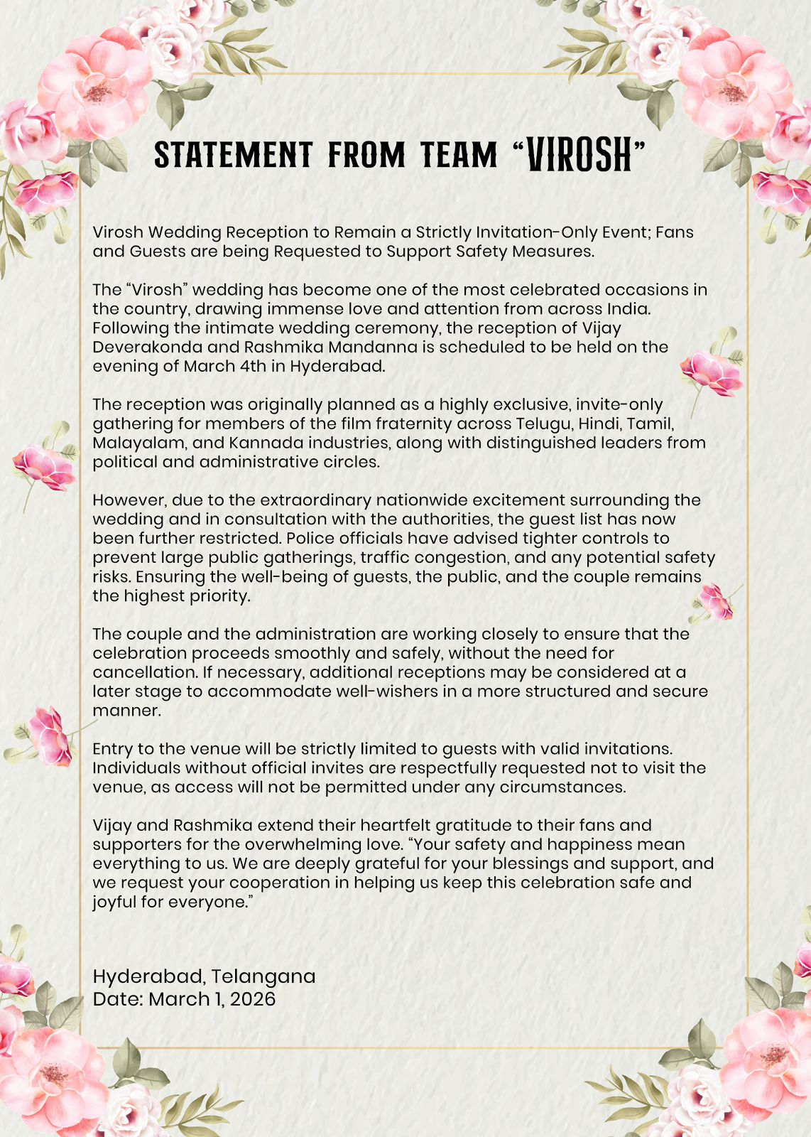 Newlyweds Vijay Deverakonda and Rashmika Mandanna have announced that their wedding reception in Hyderabad on March 4 will be a strictly invitation-only event, citing security measures and police guidance amid overwhelming public excitement.