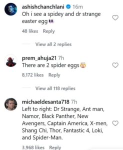 YouTuber Ashish Chanchalani commented, “Oh i see a spidey and dr strange easter egg (sic).” A fan wrote, “There are 2 spider eggs (sic).” Another fan commented, “Left to right: Dr Strange, Ant man, Namor, Black Panther, New Avengers, Captain America, X-men, Shang Chi, Thor, Fantastic 4, Loki, and Spider-Man (sic).”