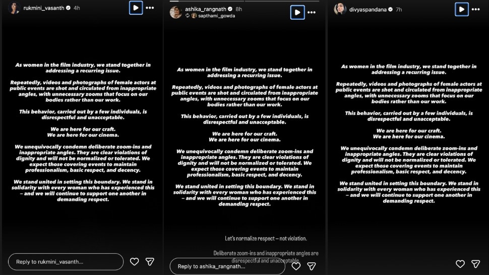 Kannada actor Rukmini Vasanth and Divya Spandana re-posted the statement on their social media platforms. Resharing the same, actor Ashika Ranganath wrote, “Let’s normalise respect – not violation. Deliberate zoom-ins and inappropriate angles are disrespectful and unacceptable.”
