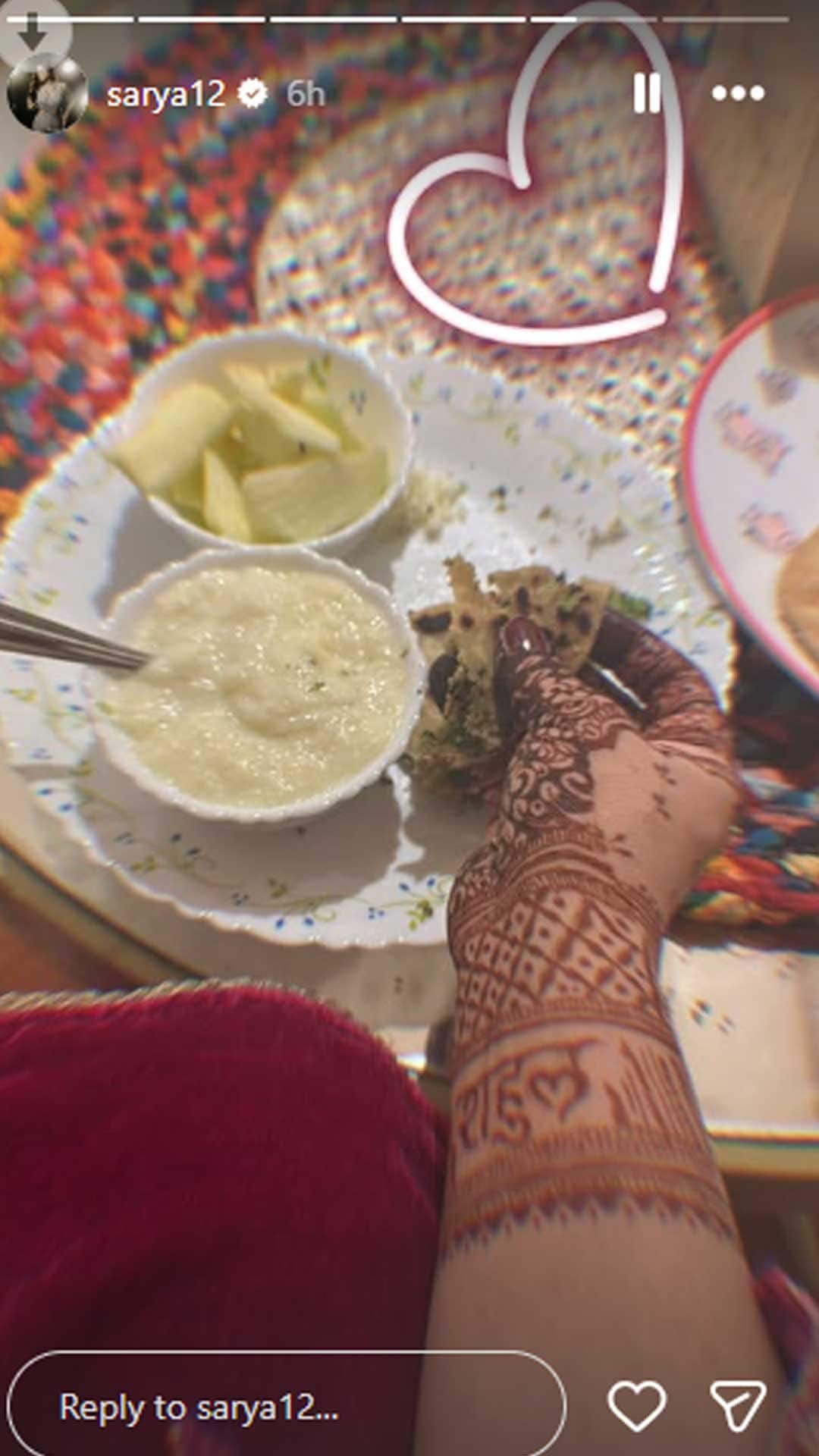 In the next story, Shraddha was seen having her food, which is called sargi, before sunrise, marking the start of her fast. Her meal included some paranthas, a sweet dish, and a bowl of cut fruits. Her hand was partially visible in the frame, showing her mehendi, which featured her husband’s name. She posted the photo with a pink heart emoji.