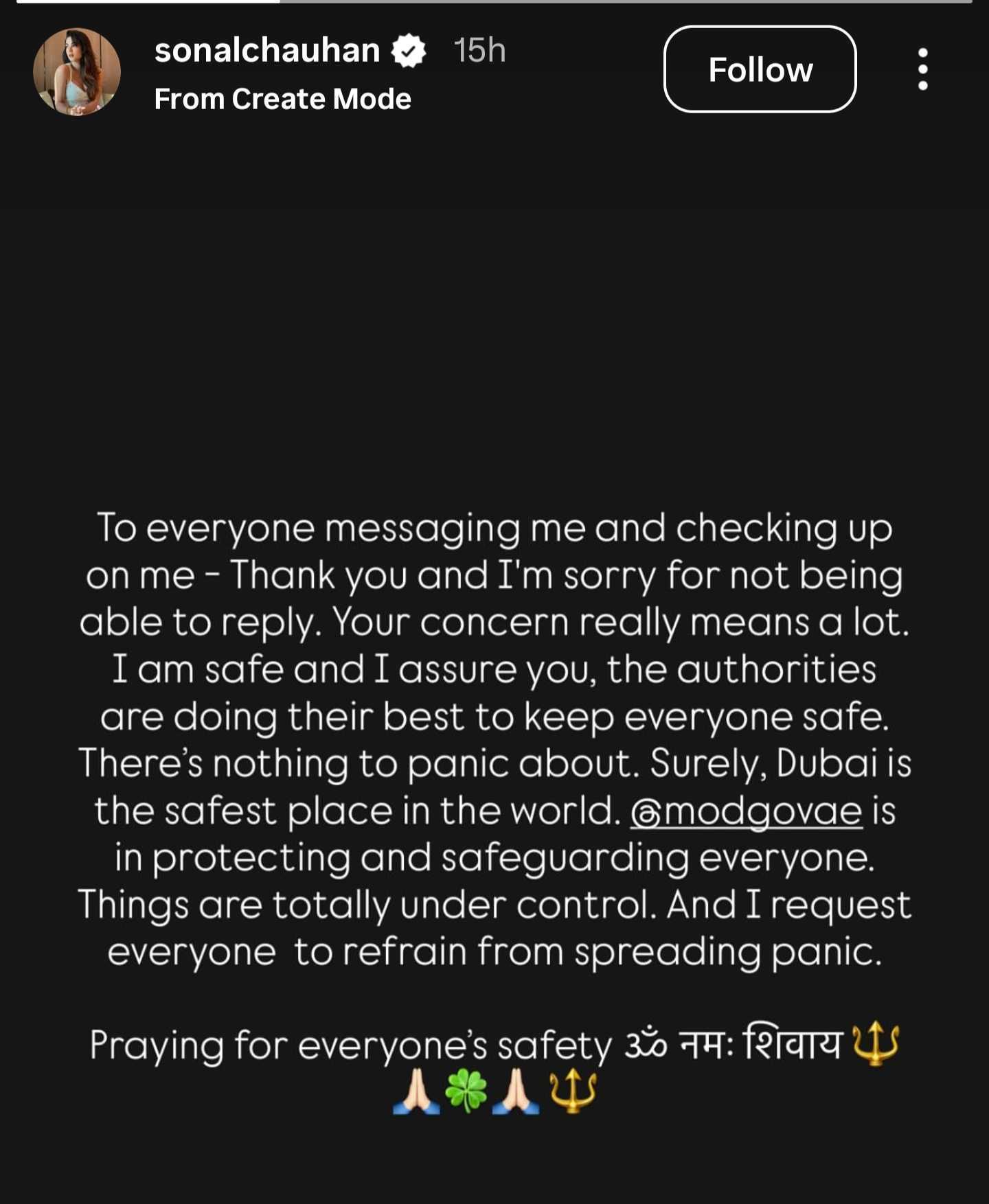 “To everyone messaging me and checking up on me – Thank you and I’m sorry for not being able to reply. Your concern really means a lot. I am safe and I assure you, the authorities are doing their best to keep everyone safe,” Sonal wrote in a note posted on her Stories.