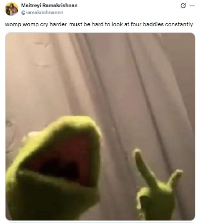 Maitreyi Ramakrishnan, who stars as Devi Vishwakumar in Netflix’s Never Have I Ever, also replied with, “Womp Womp cry harder. It must be hard to look at four baddies constantly (sic).”