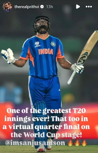 Actor-filmmaker Prithviraj Sukumaran wrote, “One of the greatest T20 innings ever! That too in a virtual quarter final on the World Cup stage! @imsanjusamson.” Tovino Thomas seemed to agree, writing, “What an innings!! @IamSanjuSamson.” Kalidas Jayaram also expressed his pride, writing, “Proud of you Macha. (buddy).”