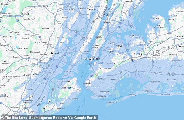 The Sea Level Submergence Explorer map reveals worst-case scenarios for major US cities. If emissions continue unchecked, sea levels could rise by 65 feet, submerging: