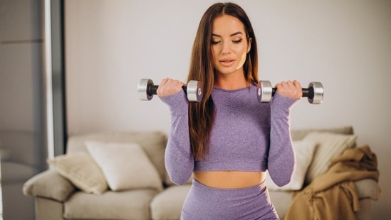“You’re going to use a heavy enough dumbbell that you’re sufficiently challenged and feeling like you cannot go on at the end of every single set, not just at the end of the workout. That’s how you know you are lifting heavy enough to actually make your muscles get bigger and change,” she says.
