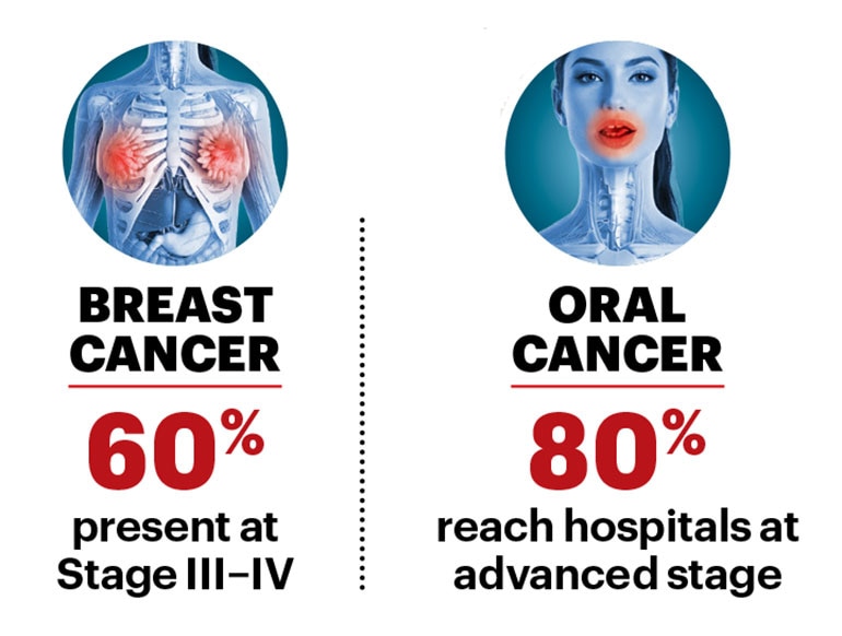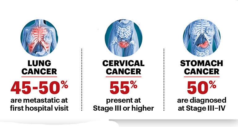 More alarming than the rise in incidence, however, is how cancers are being detected only after they have spread. A 2025 task force report from the National Academy of Medical Sciences estimates that over 60 per cent of breast cancer cases in India present at Stage III or IV—well beyond the window for early intervention. The pattern is similar across cancers: nearly 80 per cent of oral cancer patients reach hospitals at an advanced stage; 45–50 per cent of lung cancer patients are already metastatic at first presentation; over 55 per cent of cervical cancer patients seek treatment at Stage III or higher; and about half of stomach cancers are diagnosed at Stage III or IV.