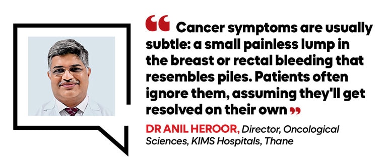 Doctors say late diagnoses are not incidental, they are embedded in the way patients seek care and how the system responds. Dr Anil Heroor, director of Oncological Sciences at KIMS Hospitals, Thane, explains that cancer rarely begins with dramatic symptoms. “The biggest challenge is that cancer symptoms are usually subtle: a small painless lump in the breast or rectal bleeding that resembles piles. Patients frequently ignore them, assuming they will get resolved on their own,” he says. Even when patients visit a doctor, symptoms are often treated without structured evaluation. “Research shows there is at least a four-month gap between the first symptom and an accurate diagnosis, leading to valuable time being lost while the disease progresses,” adds Dr Heroor.