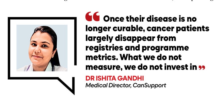 “Once their disease is no longer curable,” says Dr Ishita Gandhi, medical director of CanSupport, “cancer patients largely disappear from registries and programme metrics. Symptom burden, quality of life and place of care are not measured, and what we do not measure, we do not invest in.”