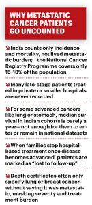 One reason metastatic cancer remains invisible in policy is the absence of data. India lacks a precise count of how many people are living with metastatic cancer. People who arrive at hospitals already metastatic, or who stop active treatment and shift to palliative care, tend to fall out of formal datasets. The same happens with patients who present with metastases at diagnosis, but later discontinue active treatment and move to palliative care. The National Cancer Registry Programme tracks diagnoses and deaths but does not follow patients when disease progresses from early stage to stage IV.