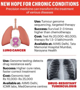 Besides cancer, precision medicine is increasingly being used to treat infectious diseases and rare genetic disorders. Tuberculosis, for one. Success in TB treatment depends on early detection. “Early detection allows clinicians to start the correct treatment earlier and prevent the spread of resistant strains,” says Dr Gunisha Pasricha, associate director, Infectious Disease Genomics at the genetic testing lab MedGenome. TB culture tests can take three–eight weeks to detect drug resistance. Molecular and genomic tests, such as GeneXpert/ CBNAAT, TrueNat and genome sequencing, can identify it within hours to a few days. That difference in time can change treatment outcomes. If needed, whole genome sequencing can detect mutations linked to resistance to 18 tuberculosis drugs, helping doctors to home in on the right medicine.