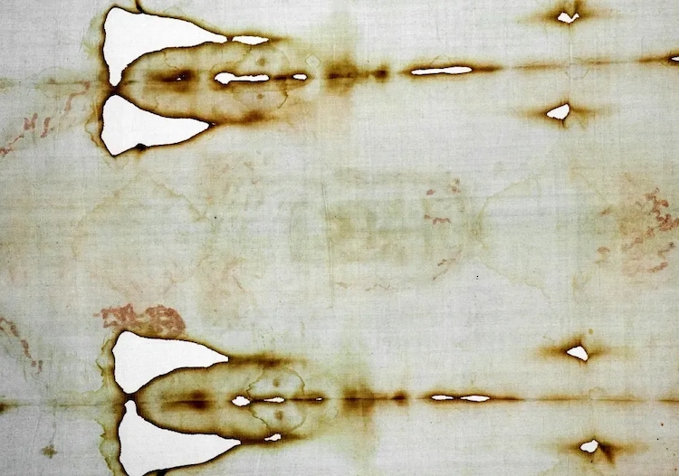 The cloth is a long linen sheet bearing the faint front-and-back image of a man who appears to show wounds resembling crucifixion injuries. Many believers have regarded it as the burial cloth of Jesus Christ.