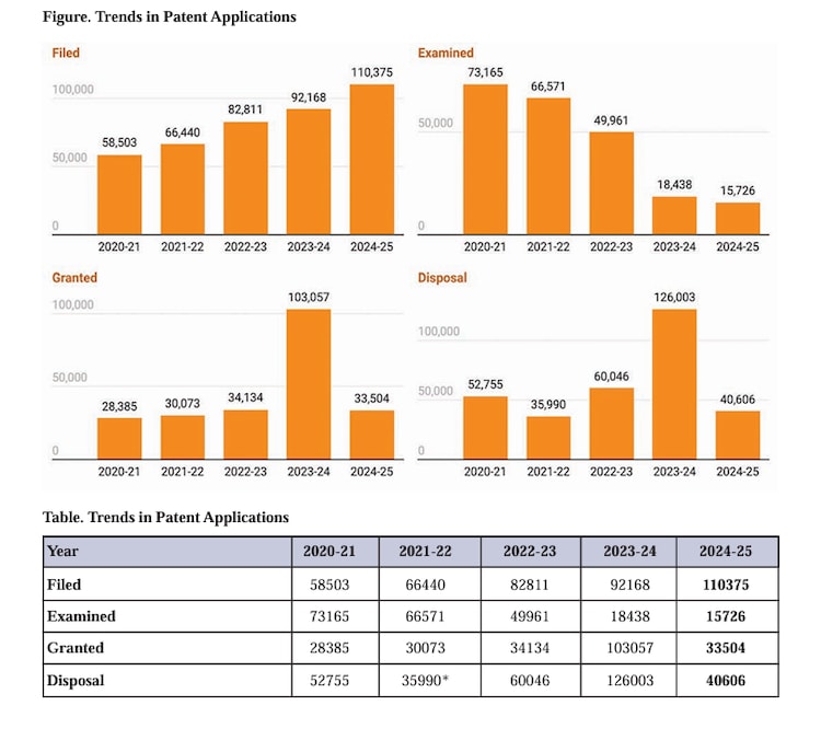 The Intellectual Property of India Patents Annual Report 2024–25 notes that India crossed the 1 lakh patent filings mark for the first time. It is a milestone year with filings increasing from 92,168 in 2023-24 to 1,10,375 in 2024-25, an increase of 19.75%.