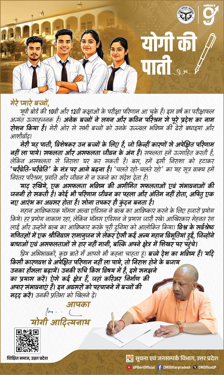 In a heartfelt and motivational gesture after the declaration of the Uttar Pradesh Class 10 and 12 results, Chief Minister Yogi Adityanath wrote an inspiring letter to students.