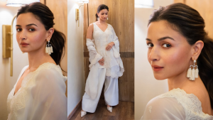 But her subtle styling details are what made this look feel ethereal. Alia wore a pair of pearl chandelier earrings by Hanut Singh and completed the look with pointy embroidered juttis by Needledust, which kept the look grounded and iconic.