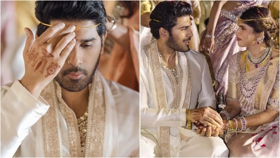 The couple’s wedding attire is a stunning display of traditional elegance and meticulous detail. Allu wore an off-white silk sherwani featuring intricate gold embroidery along the placket and collar, paired with a matching dupatta draped over one shoulder. His look was completed with a delicate gold chain headpiece featuring a small, ornate pendant at the centre of the forehead.