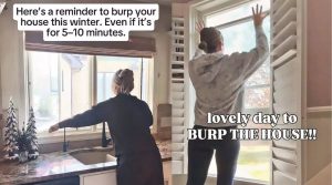 Doctors say house burping, in all seasons, really works. Household items like furniture and mattresses release chemicals into the air that are likely to cause headaches, itchy eyes, and breathing issues. Opening windows to get rid of stale air and make way for fresh air can help. It is also believed to help control household mould.