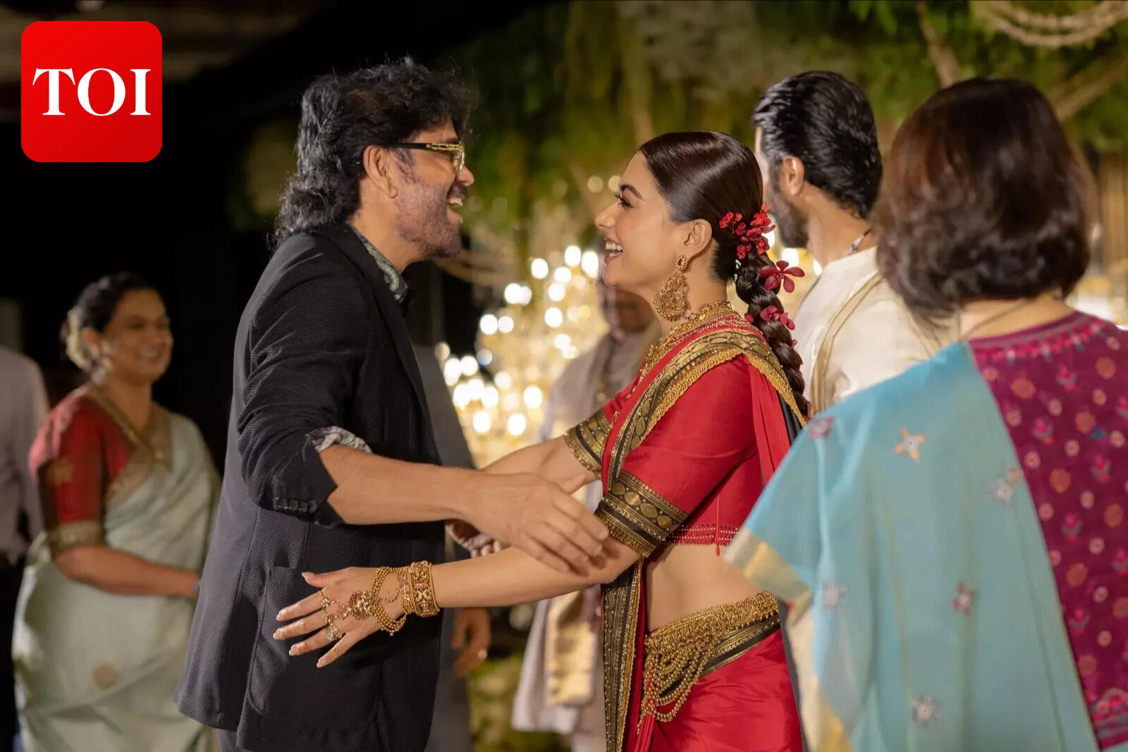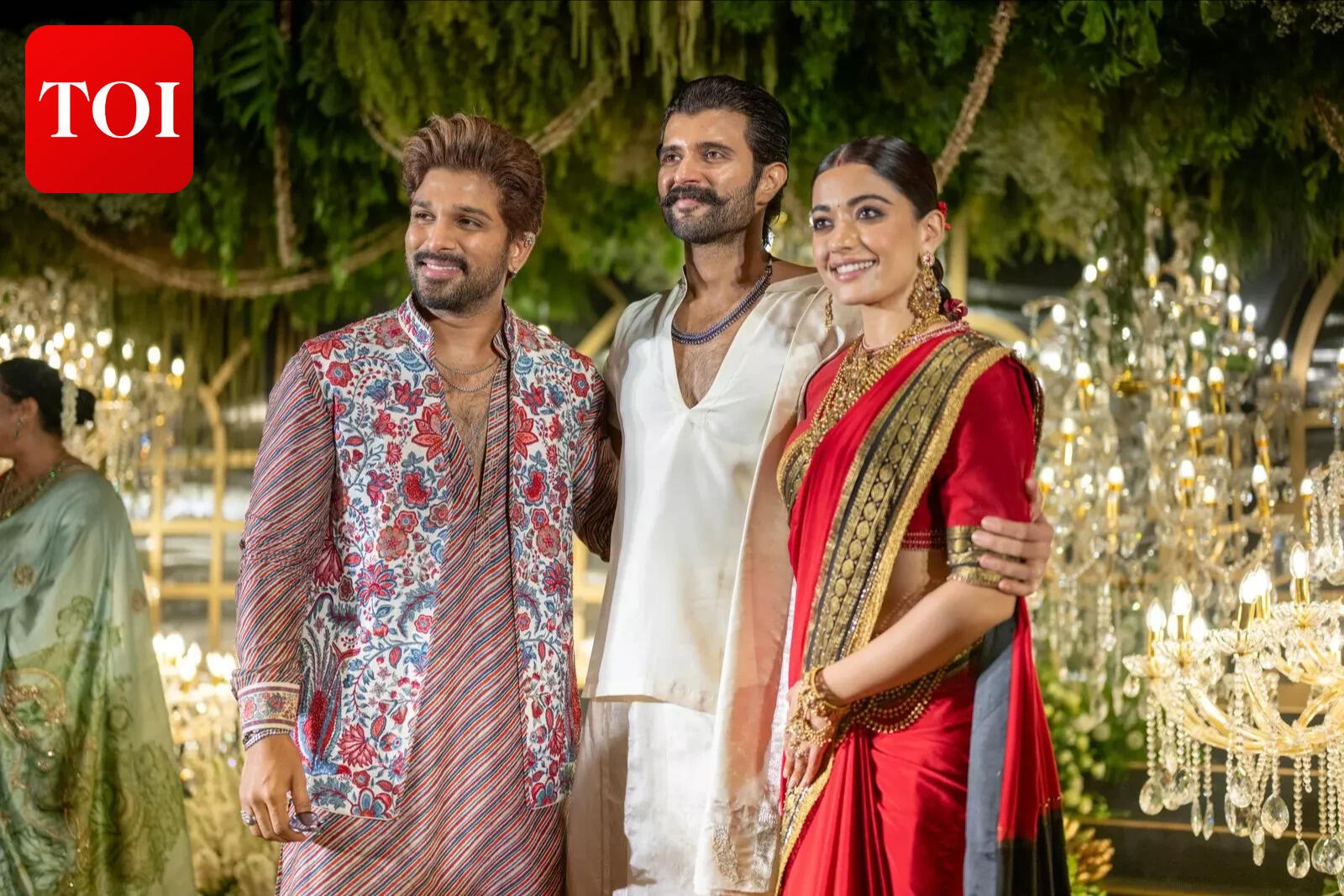 For the grand evening, Rashmika looked radiant in a bright red saree adorned with a gold and green border. She styled it with heavy gold jewellery and flowers woven into her braid, embodying classic bridal elegance.